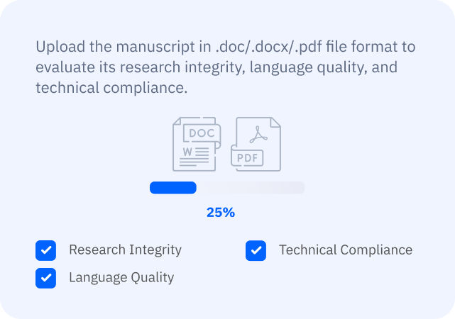 Upload the manuscript in .doc, .docx or .pdf format and Preflight will evaluate research integrity, language quality & technical compliance