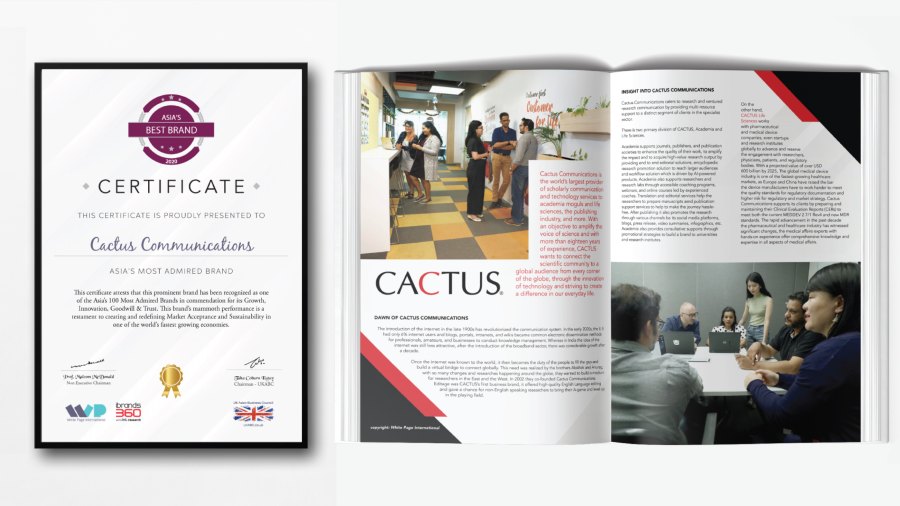 Cactus Communications was recognized as one of Asia’s 100 Most Admired Brands 2020 and its co-founder and CEO Abhishek Goel as one of the 100 Inspirational Leaders of Asia 2020. These awards were handed out by White Page International, a global consulting firm with a diverse portfolio that includes brand consulting, print advertising, AV production, creative advertorial promotions, PR and research.